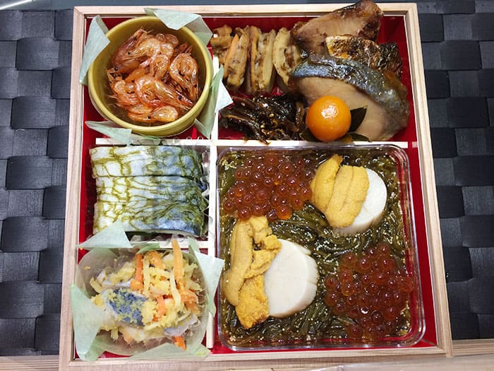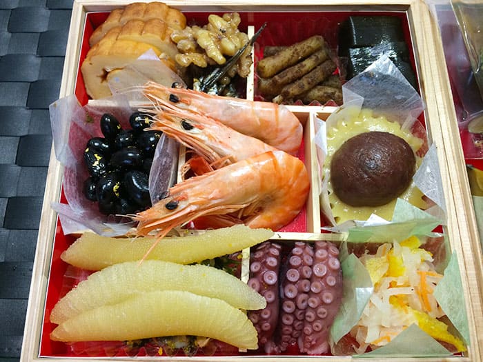 1.伊達巻、2.ごまめクルミ和え、3.たたき牛蒡土佐風味、4.さけ昆布巻、5.黒豆甘露煮(金箔添え)、6.祝海老、7.きんとん、8.渋皮栗甘露煮、9.味付け数の子、10.貝真砂和え、11.蛸やわらか煮、12.伊予柑なます